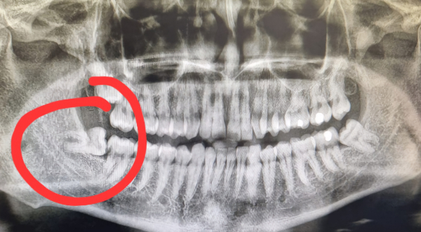 親知らずが完全に埋まっている場合、その周りに嚢胞(のうほう)と呼ばれる膿が溜まった袋状の病変ができることがあります。嚢胞が大きくなると、顎の骨を圧迫し骨が破壊されることもあります。