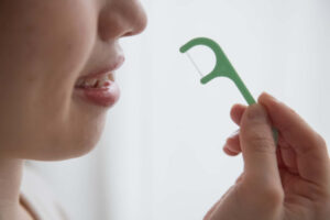セラミックの歯を長持ちさせるために歯間ブラシで手入れをする女性